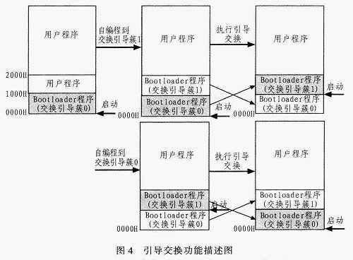 产品程序的升级包括应用程序的升级和引导程序(Bootloader自身)的升级。为了防止引导程序在升级的过程中发生错误,从而导致MCU无法启动,设计了引导交换功能。以图4说明引导交换的实现过程。