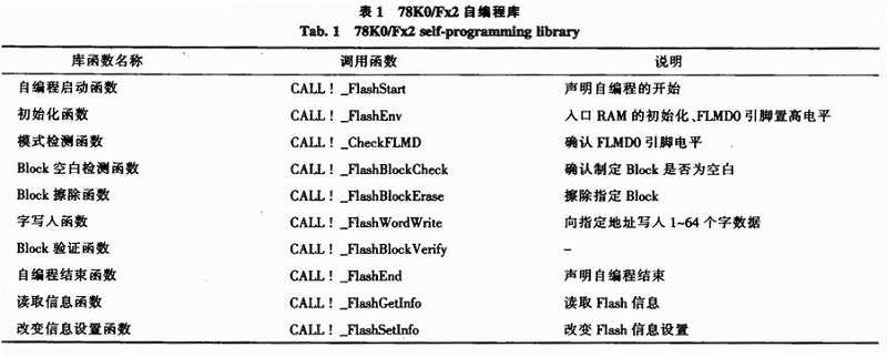 自编程功能利用自编程软件库完成用户程序对Flash内容的重新编程。如果在自编程的过程中有中断发生,那么自编程将暂停来响应中断。中断结束,自编程模式恢复后,自编程过程将继续进行。采用汇编语言编写78K0/Fx2自编程软件库,如表1所示。