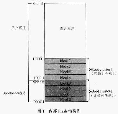 为了防止Bootloader自身的升级失败,设计了引导交换功能。该功能定义2个簇,即Boot cluster0和Boot cluster1。Boot clustee0为block0~block3的4 KB存储空间,Boot cluster1为block4~block7的4 KB存储空间。因此,实际运用过程中,一般把应用程序的开始定义在2000H,也就是从block8开始。