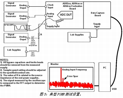 PSMR的测量方式基本上与PSRR相同。不过在测量PSMR时,需将一个模拟输入频率施加于测试设置,如图3所示。