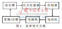 通常对安全帽特性的检测主要包括两部分:耐穿刺性能试验和抗冲击性能试验。根据国家标准GB/T2812-2006的要求,安全帽经过预处理后,其耐穿刺性能试验和抗冲击性能试验分别以3 kg的尖锤和5 kg的重锤距离安全帽顶部1 m处作自由落体运动,在符合正常操作条件的情况下,帽壳无碎片脱落表示安全帽合格,否则为不合格[2]。本文设计的安全帽特性检测仪总体上以电动机带动电磁铁在导向圆筒内上下运动,利用检测仪的开关量输出电路控制电磁铁上重锤的吸合或释放与电机的正反转,并利用高精度的压力传感器对瞬间冲击压力进行采集,最后将采集的数据输入到控制器进行处理。总体设计方案如图1所示。