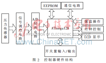 本文在设计硬件电路时,以ATmega128单片机为控制核心,外扩有压力传感器输出信号调理电路、A/D转换电路、开关量输入/输出电路,以及通信、数据存储、时钟控制、键盘操作和LCD显示等辅助电路[3-4]。控制器硬件结构如图2所示。其中信号调理电路用于对压力传感器GH-4输出信号的放大和滤波,并利用以AD974为核心的模拟量采集电路进行精确转换;开关量输入/输出电路主要用于升降机上下限位的检测和电机正反转的控制。