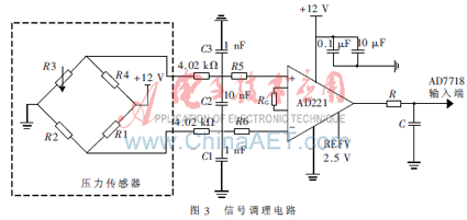 在图3中,虚框内为桥式压力传感器,传感器输出的两个共模差分信号经过由电容C1、C2以及4.02 kΩ的电阻构成射频干扰抑制电路进行去噪处理。其中电容C1抑制差动干扰信号,C2抑制两输入端的共模干扰;RG为增益电阻,根据AD8221数据手册,本设计选300 Ω的增益电阻将信号放大100倍左右,即将传感器输出信号转换到0~2.5 V范围内。