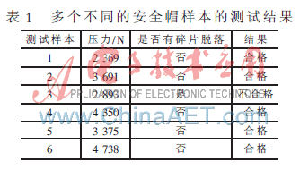 本系统经过大量的测试试验验证,该检测仪的稳定性好,而且试验的结果直观,所测试的试验数据均能达到国家标准的要求。对多个安全帽样本进行测试,测试结果如表1所示。