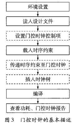 在RTL 级,门控时钟的实现不需要对设计本身进行修改,而只需在综合脚本中加人一些控制项。本文采用多级门控时钟,相关的脚本如图3 所示。图中,传统的综合流程用实线标出。虚线部分为门控时钟的操作。控制项set_ clock_gating_style 是门控时钟的核心。它的参数大小决定门控时钟的质量,对功耗的优化效果和对CTS 的影响。目前尚无完备的体系介绍如何设置控制项以使门控效果达到最优。本设计中有以下各个参数的设置方法。