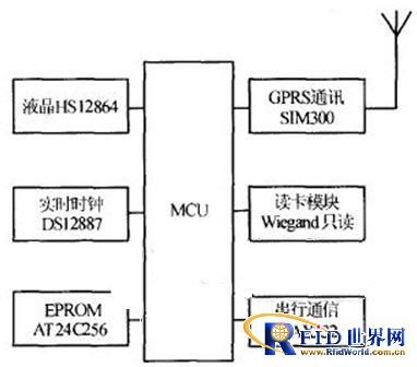 液晶显示模块、实时时钟模块、EPROM存储模块和串行通信模块都是作为一个考勤系统的通用模块,图中标注了采用的芯片。