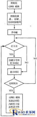在以上的硬件基础上进行软件的编写,采用标准C语言 实现主要功能:初始化各外围的功能模块,显示当前的时间,提供系统的时钟,存储并通过GPRS模块发送员工打卡的参数等。具体的简化流程图如图5所示。在软件编写时,难点在GPRS模块设计部分,主要包括:模块的初始化和数据的TCP传输。模块初始化方面采用上电自动复位开机,初始化要完成GPRS网络登陆的初始化过程。MCU通过串行口发送AT命令来完成。