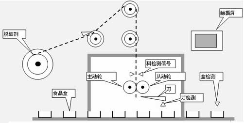 投入的准确性是靠调整前机时间来保证的,在食品盒到达投入口正下方之前要进行切断动作,而食品盒到达投入口正下方时干燥剂要正好投入到食品盒当中,送料停止到切刀切断之间的时间就是前机时间。