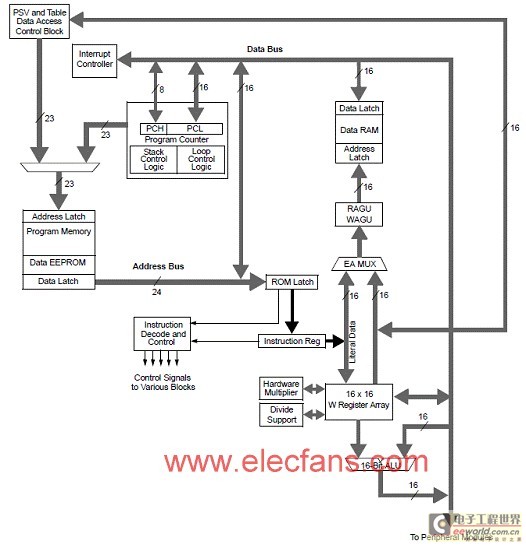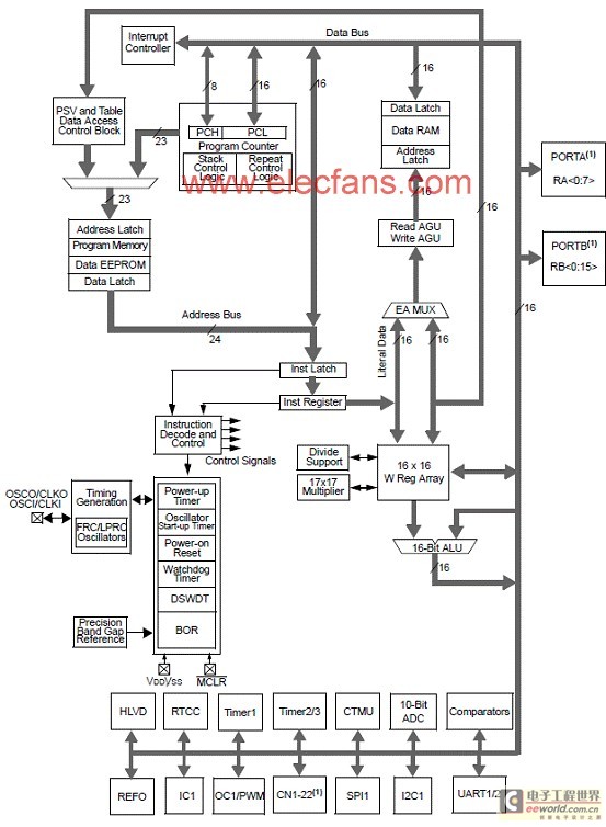 图2。PIC24F16KA102系列PIC24F CPU核方框图