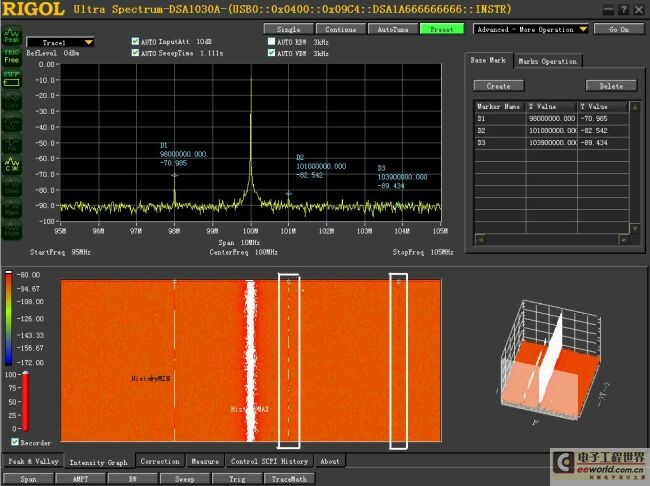 Ultra Spectrum通过对数据DSA1000系列频谱仪产生的数据进行处理完成了频谱仪的时域应用与分析,无需对原有频谱仪器做任何修改,仅通过获取其产生的原始数据稍加变化就增强了原有频谱仪的功能,本文仅简单介绍了发现捕获可疑信号分析可以信号的例子,如果配合其它仪器数据使用还可以广泛拓展该应用(例如,根据时域信息进行温度数据的存储即可以时间信息为“桥梁”建立起频域与温度之间的关系)。RIGOL DSA1000系列是一款低端频谱仪,它具有低廉的价格和丰富的本机功能,Ultra Spectrum作为其上位机对其进行了更多功能性的扩展,使这一套频谱测量工具的功能更加强大易用。