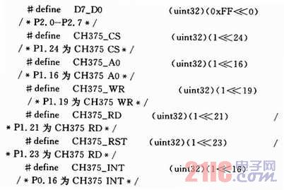 本系统软件设计时采用μVision3 IDE,μVision3IDE是一个窗口化的软件开发平台,它集成了功能强大的编辑器、工程管理器以及各种编译工具(包括C编译器、宏汇编器、链接/装载器和16进制文件转换器),通过ULINK仿真调试。程序框架采用传统的前后台方式。CAN控制器驱动程序包括4部分内容:CAN控制器的初始化、报文的接收、报文的发送和总线异常处理。由于LPC2119没有开发内部读写总线,本设计在对CH375操作时使用通用I/O模拟并口读写时序,其端口定义方式如下: