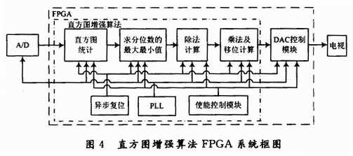 图4给出了直方图增强算法的FPGA系统框图,A/D转换后的14 b数据流进入直方图统计模块计算每一像素点的直方图,根据设定好的分位数计算图像中像素的最大值和最小值。在每一帧有效数据结束后,根据直方图统计得到的最大值和最小值,计算灰度映射的除法,这样每帧只需计算1次除法,而不用对每一像素进行除法计算。之后对得到的因子对每一像素进行乘法及移位计算即可得到直方图增强算法处理后的图像数据。增强后的图像数据通过DAC控制模块送入电视显示。