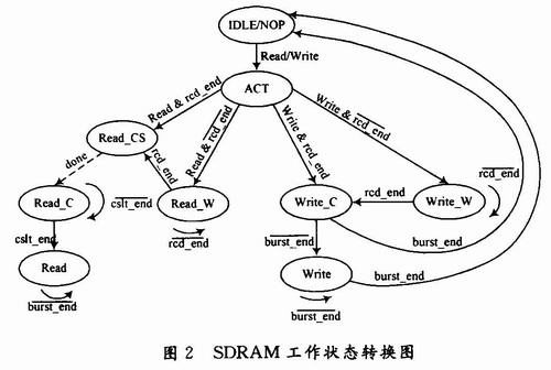 FPGA外接SDRAM做为外扩存储器。SDRAM芯片选用HY57V561620,该芯片为16位的SDRAM,工作频率为100 MHz。SDRAM工作状态转换图如下: