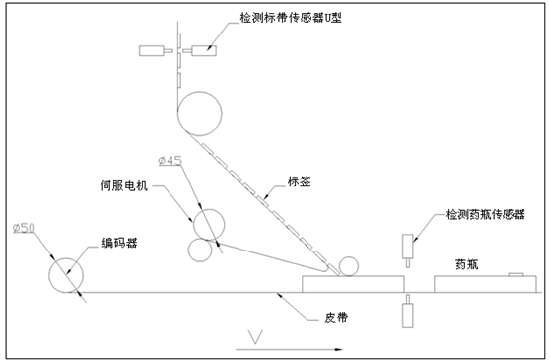 贴标机贴标部分工作原理图如下: