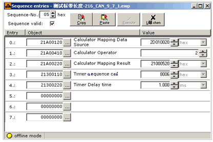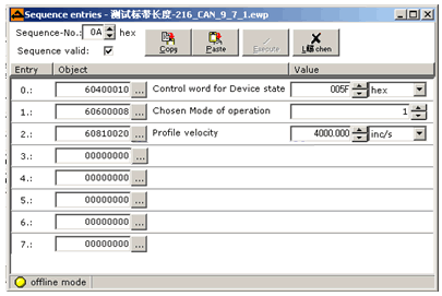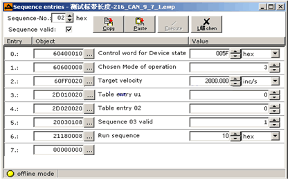 类似的方法,编程计算得出“c”和“a”的值,并将“a”值写入“607A0020”(位置模式下的“目标位置”),每次贴标时当检测到“1”的位置后将转入1个相对定位,定位长度为“a”值,从而实现贴标的要求。Sequence A为用于相对定位的程序。