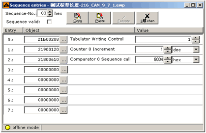 Sequence 3说明:电机拖动标带低速运行,把标签传感器第1次检测到的位置(图2中“3”位置)写入内部表格地址(2D010020)。同时对计数器0的计数值加1,在本段程序中最后一行调用了比较器0(Comparator 0),比较器0的设置如下,比较器判断计数器内的值(21900220)=2时调用Sequence 4,而21900220是用于保存标签传感器(PNP)的下降沿信号次数(也就是边沿位置写入次数),21900220=1,说明检测到图2中对应的“3”位置,21900220=2,说明检测到图2中的“4”位置,之所以“2”、“3”和“4”位置值能够被自动保存到2D000120、2D000220、2D000320中,是利用了“Tabulator”功能, “Tabulator”为驱动器内用于保存批量数据的一块地址区域,类似于一个数组,共有256个连续地址用于存储数据。将数据保存到该地址区域,需要利用“21B0”这个对象, 每写入1次,该对象指向的地址(用于保存数据的地址)将自动增加1。如本例,每保存1次“60630020”的值,保存的地址将自动增加1,为了测量标带长,只需要保存3次“60630020”的值,一旦完成,将跳转到Sequence 4。