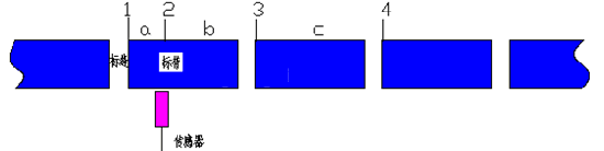 基于控制机理要知道如图所示长度a,从图中我们知道a和b分别是一个标带和标缝长度,c是a和b之和,那么通过测量长度b和c,由c减去b即可得到a。如果要得到b和c的长度,就要知道2、3和4位置的值。 测量时,首先将电机当前位置值2存入变量Var1,然后让伺服以一个极低的速度牵引标带,到了3号位置(由U型传感器感应)将电机位置值存入变量Var2,到了4号位置存入Var3,最后根据这3个值计算出a,这样伺服每次贴标运动末端都走一个定位长度a,然后停在如图所示2的位置。