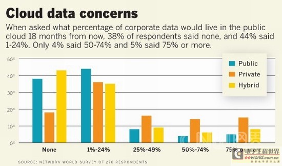 在截止至今的18个月的时间内,美国《Network World》网站对于有多少公司的数据存储在公有云上展开了调查。有38%的受访者称,没有将公司的任何数据存储于公有云上;44%的受访者称,1%~24%的公司数据存储在公有云上;仅有4%的受访者称,50%~74%的公司数据存储在公有云上;5%的受访者称,75%以上的公司数据存储在公有云上。