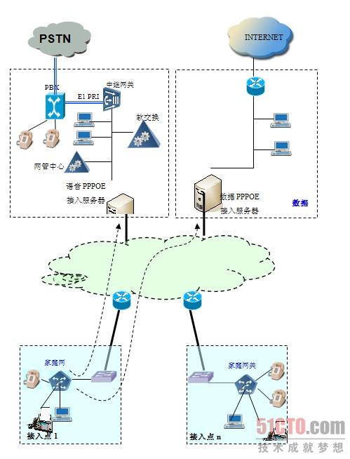 语音网的关口处放置有语音PPPoE接入服务器,负责语音PPPoE的接入,语音网关和语音网中软交换,中继网关,网管中心等系统,共同实现VoIP业务。