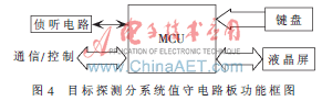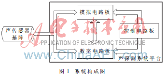 声探测系统由模拟电路、数字电路和控制电路组成。模拟电路完成对传声器阵列送来的微弱信号的放大、调理、均衡,并将预处理后的信号送至后端电路处理。数字电路实现对目标声信号的采集、定向算法、识别算法、增益控制、电路逻辑控制以及外部接口功能。控制电路由电源管理和人机界面组成。图1为系统构成图。