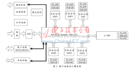 用于实现高速数字信号处理的DSP,一片作为主DSP,实现信号的预处理、增益控制、外界通信、数据关联等工作;另一片作为目标识别DSP,完成已定向目标的类型识别功能。其余5片,完成主DSP分配的目标频点的信号处理及定向。每片DSP具有独立的程序、数据空间。数字电路设计模块图如图3所示。