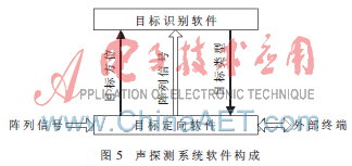 声探测系统软件完成对数字化声信号采集、模拟电路放大电路的增益动态实时调整、系统参数的初始化配置,核心是实现声目标信号的高速实时处理后的定向、识别功能。软件分为两大部分,即目标定向软件和目标识别软件。软件构成如图5所示。