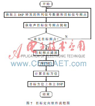 从DSP的目标定向特征是根据获取的频点信息,针对性地对目标信号在指定频点上进行检测,采用MUSIC方法逐个解算各频率对应的定向结果。将各谐波信号与对应的定向结果以及频率能量信息建立文件记录,并传送给主DSP 进行综合处理,获得目标定向结果。目标定向软件的软件流程如图 7所示。