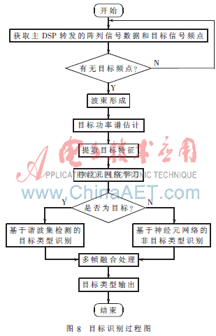 主DSP实现了目标频点检测和定向跟踪。目标频点检测是在目标信号的宽谱和多谐波特征基础上的目标频点提取。在频点检测中,设计了合适的检验统计量与准则,并且通过大量外场实验验证,获得了理想的恒虚警似然比门限。