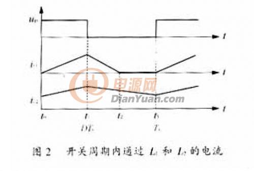在单级PFC变换器中,为了实现功率因数校正,通常控制PFC级的Boost电感工作在不连续导电模式;而为了提高变换器的率,DC/DC级一般采用连续导电模式,在一个开关周期内,通过L1和L2的电流如图2所示。为了使Boost电感工作于DCM,则有